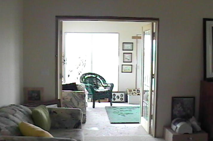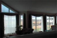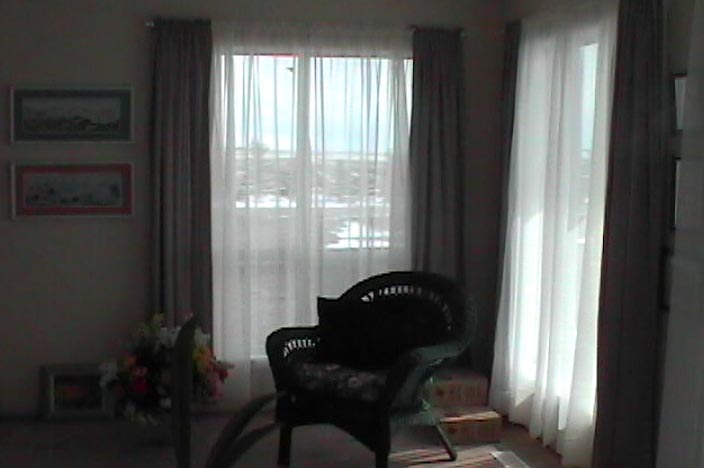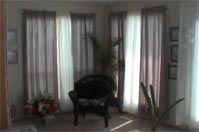 Each Window in the Sunroom has a set of Eggshell Sheers, including the Windowed Sundeck Door. Very pretty. These drapes are soft and elegant -- this is already a fantastic room, but these Window Dressings take it right over the top!